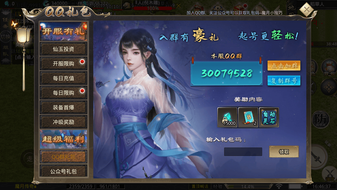上线领取上线就送自动灵石、经验;升级领取远程回收。